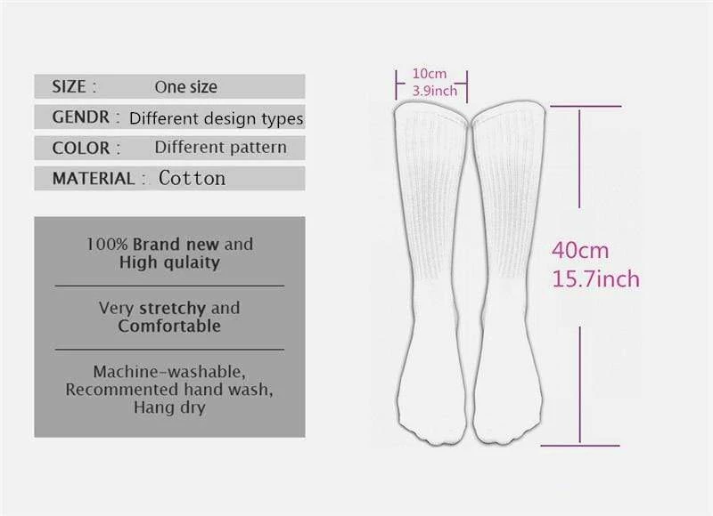 - These funny novelty high socks are available in 18 different variants. Choose one that matches your personality most, or just collect all designs