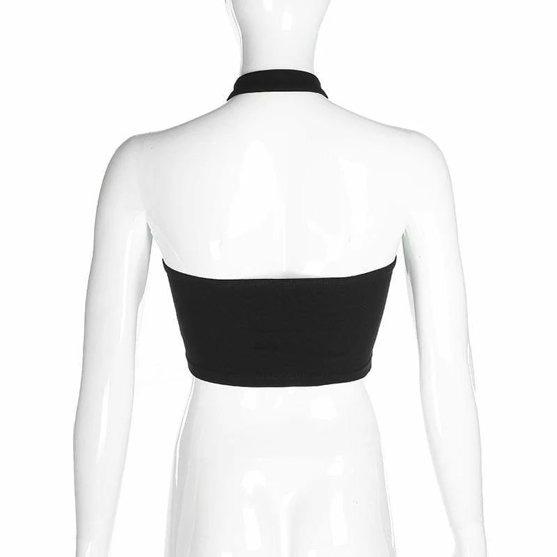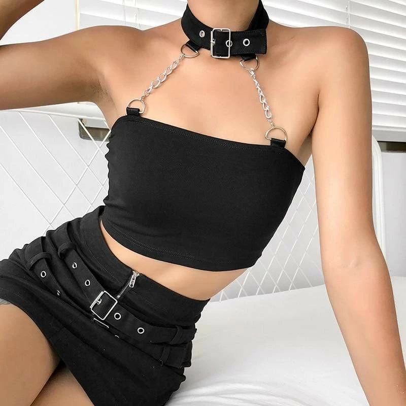 - This black, mini, sleeveless, halter top is made from quality Cotton and Spandex materials to give you a really in-character gothic ensemble