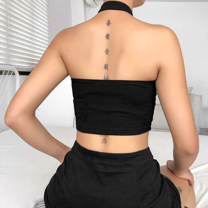 - Please check the size chart below for the accurate fit of this black, backless tee