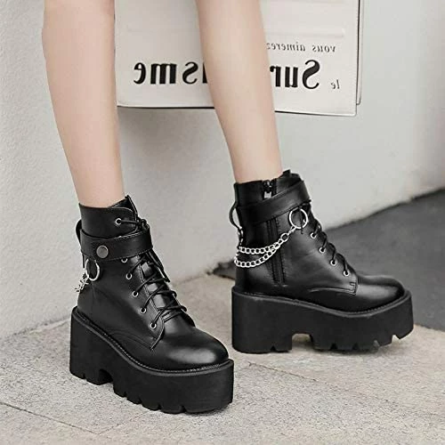 - Looking for a pair that will complete your korean look? You’re search is over! These chain leather platform boots feature a stylish chain decoration at the back, thick high heels, and made from a soft leather style. This plain yet gorg black pumps will keep you in fashion wherever you go