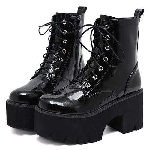 - Happiness is when you can do all tasks with a comfy and very fashionable pair of boots! This black, chunky combat shoes feature a sexy laced-up tie decoration, stylish platform wedge heels, and made from a soft leather style. Wearing this women’s pair will surely make heads turn