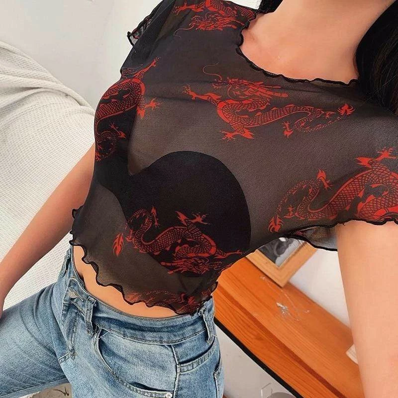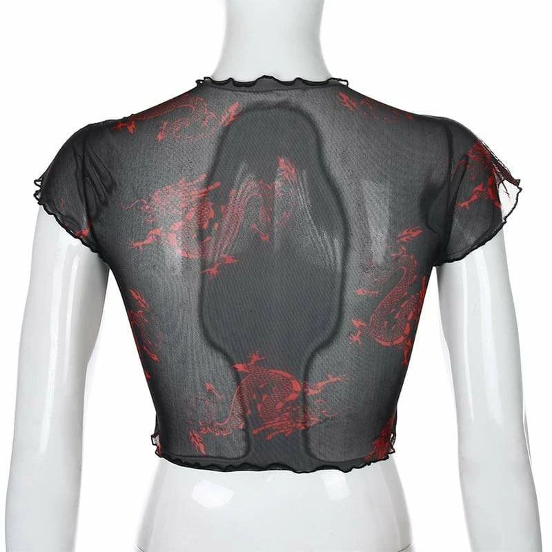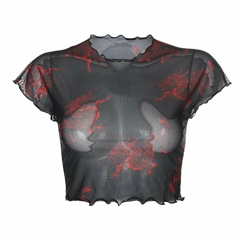 - It features red dragon prints all over the see-through black mesh fabric, short sleeves, crop top, and round-ribbed neckline