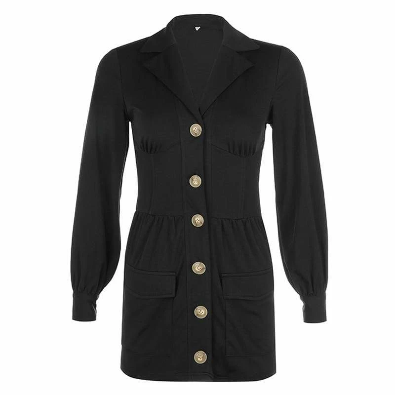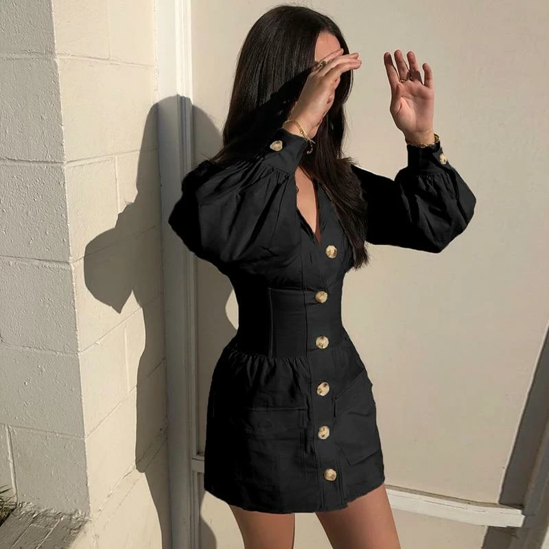 - Vintage, black dresses are elegant in their own way. This black dress features big buttons in front, long sleeves, v-neck line, and short cut to define your perfect figure more