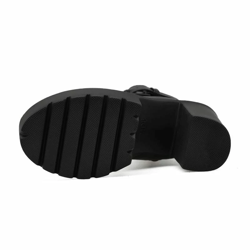 - Rock, unique, and chunky. This Motorcycle High Heel Platform Boots feature an elegant style, thick high heels, metal buckle and belt strap on the ankle, tie lacing closure, high cut, and guaranteed made to keep you fashionable whatever the occasion is