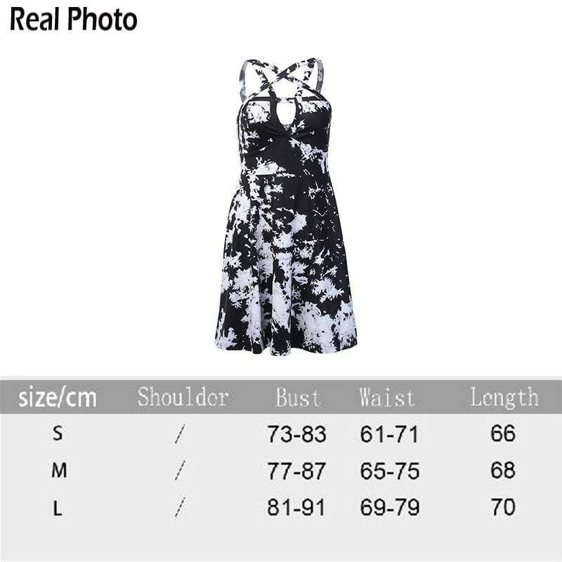 - It features an spaghetti strap, bandage design in front, cleavage cut out, and a black and white prints all over the fabric