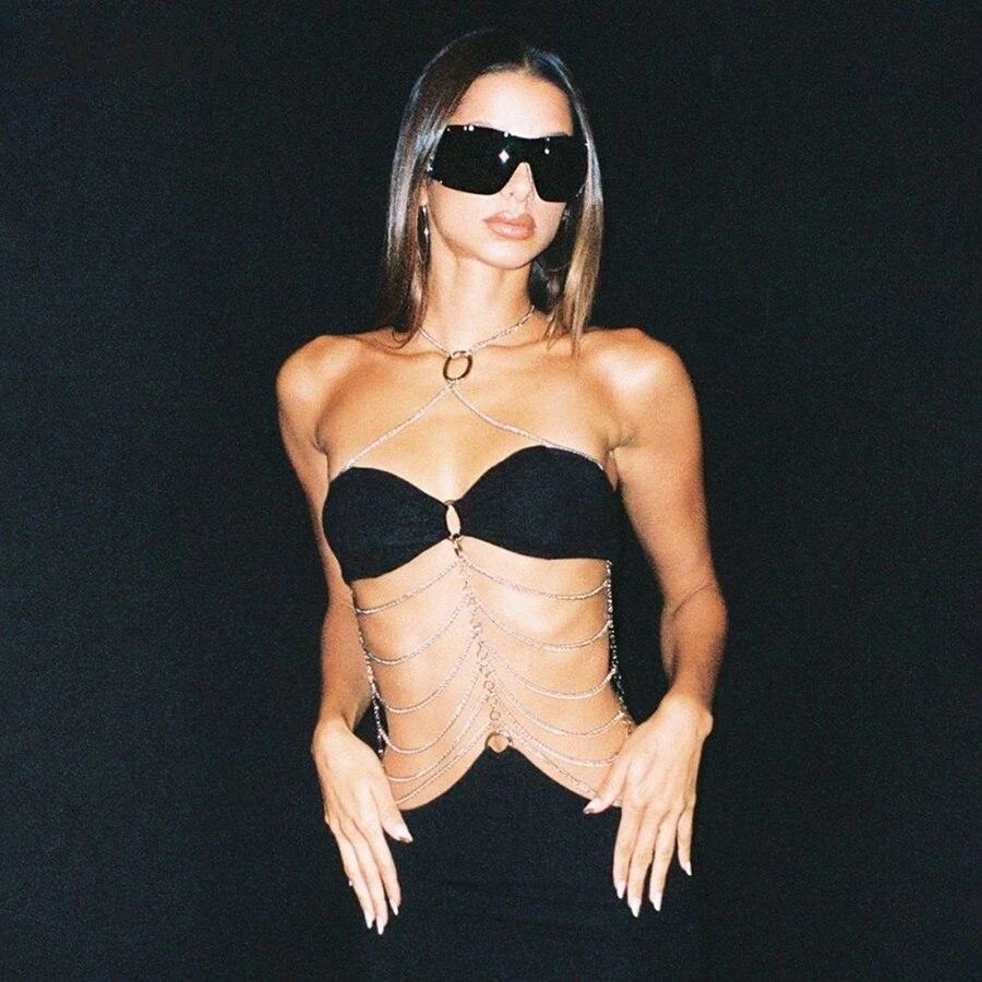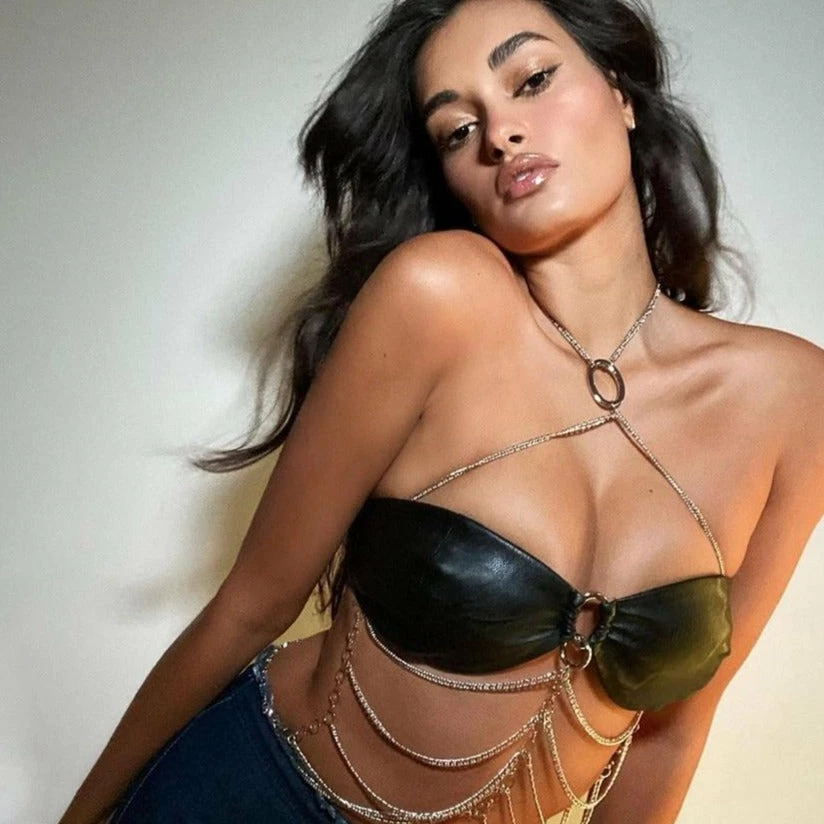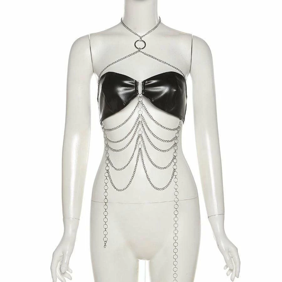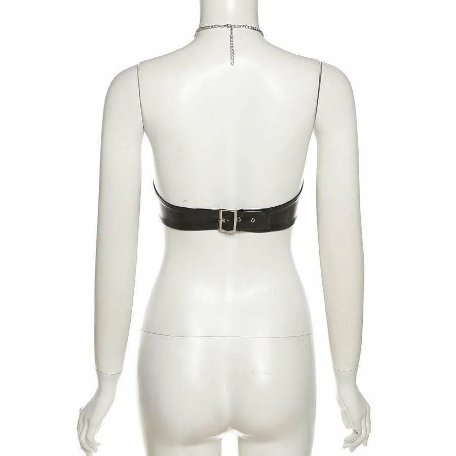 Kinky Cloth Halter Chain PU Leather Bra Top & Tees