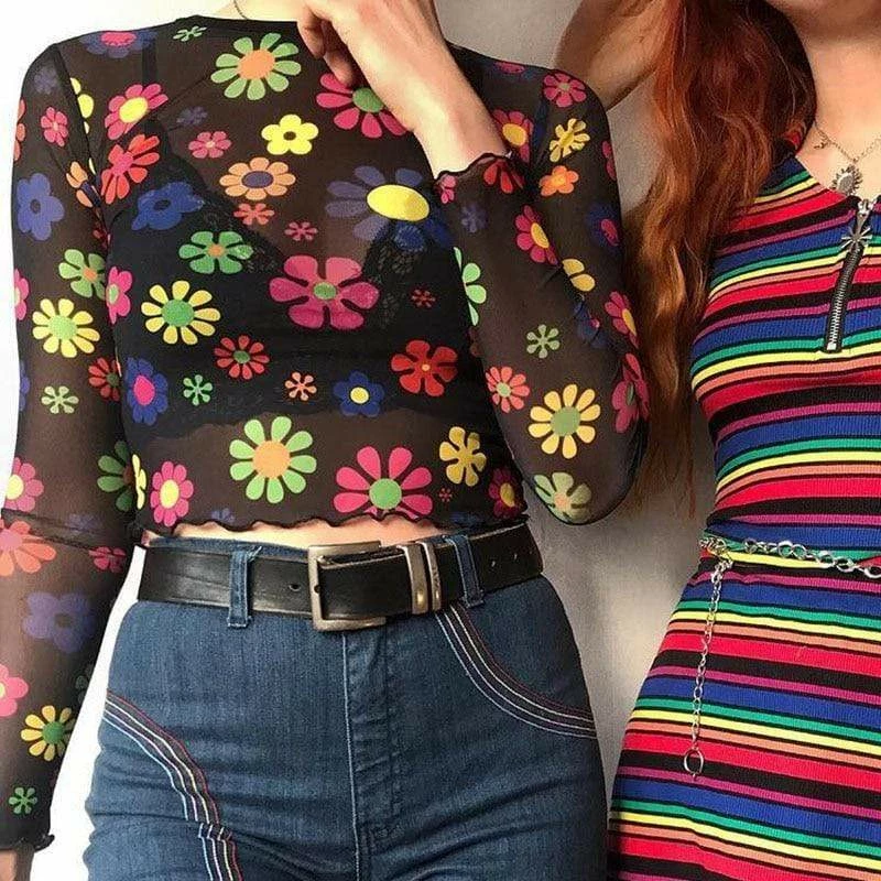 - This multi-colored Hippy Flower Sheer Top can be your go-to outfit during day, and also perfect for events such as parties, festivals, concerts, costume parties and cosplays.