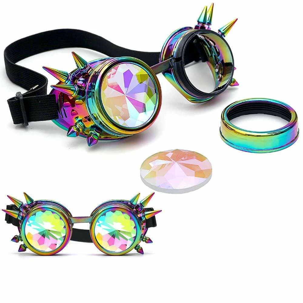 - The Kaleidoscope Glasses feature removable multi-faceted crystal lenses and a round frame design, with designs that radiates a steampunk vibe.