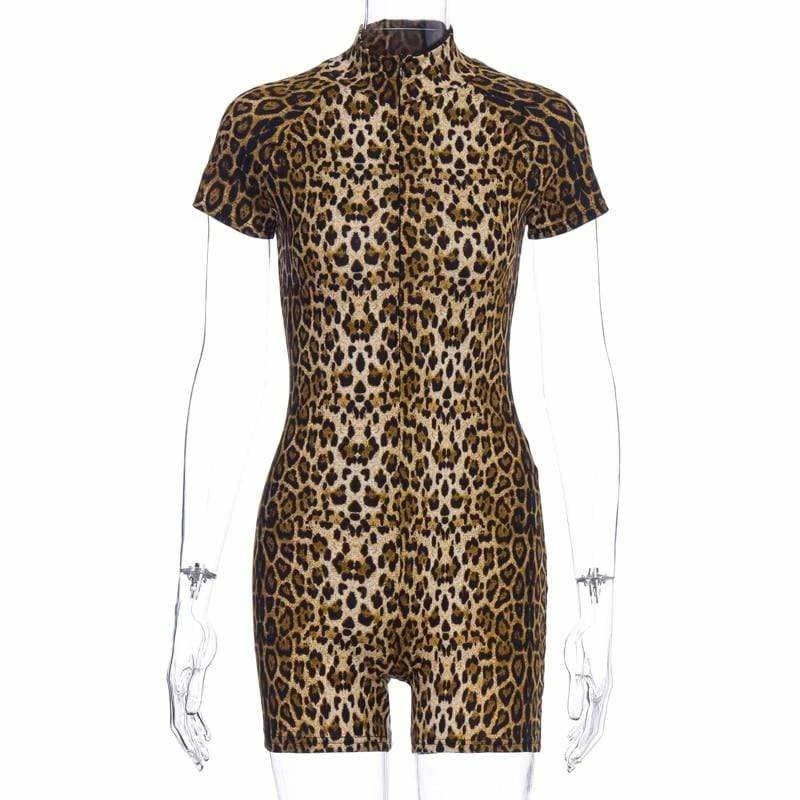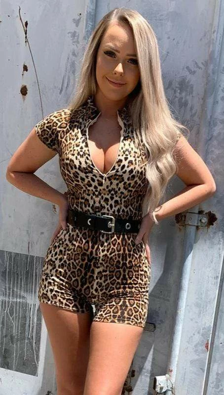 - Sexy, eye-catchy and appealing. The Leopard Print Zipper Playsuit is a chic bodycon bodysuit that features a zip-up closure in the front, body-hugging design and carefully crafted leopard prints all over the suit