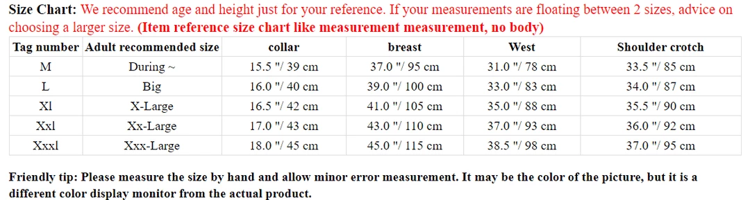 | Size | M, L, XL, XXL, XXXL |