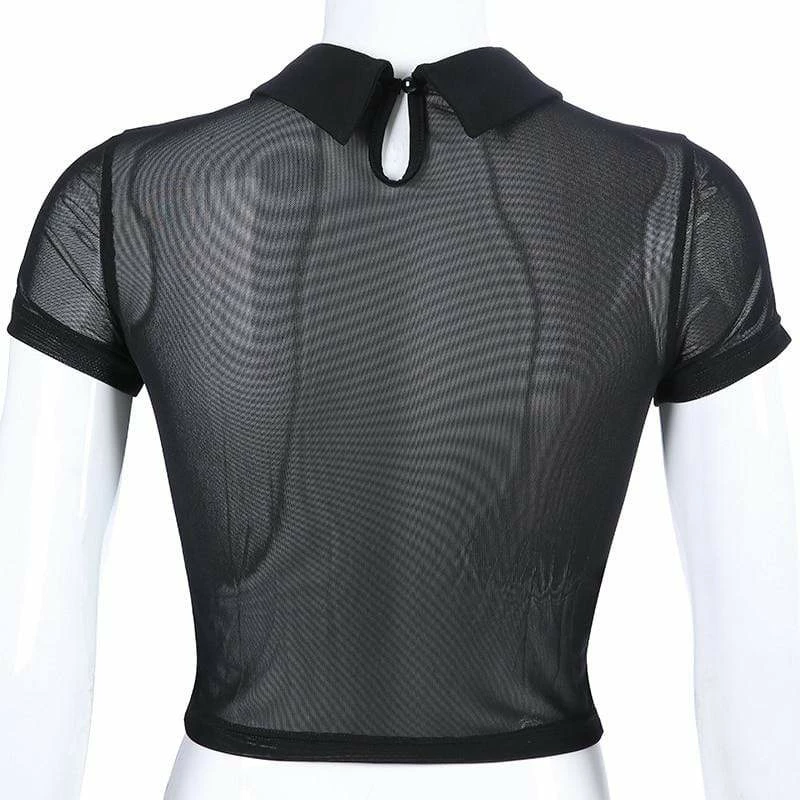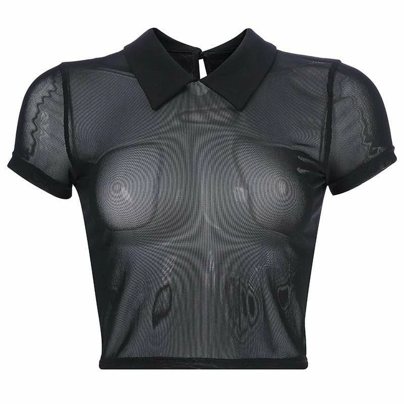 - It features a basic black color, full mesh fabric, collar, and short sleeve