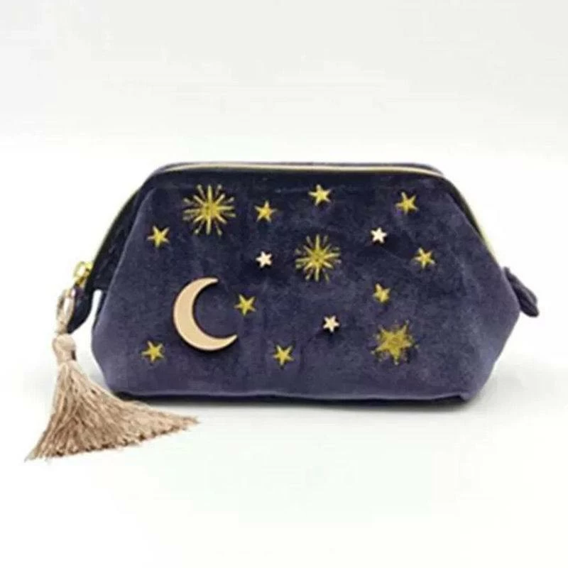 - Striking, eye-catching and very compact. The Moon Star Velvet Cosmetic Bag with Tassel is a  fashionable purse that not just captivates everyone’s heart, but is also proven to be spacious to store your things and has 2 extra compartments inside for your small things