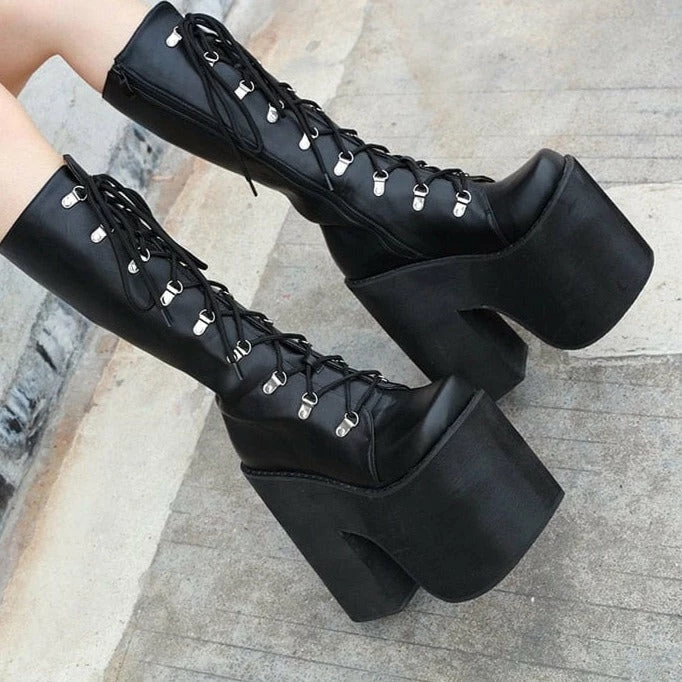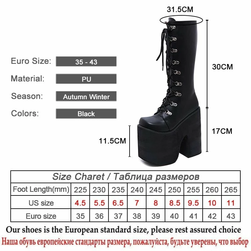 SKU: 7062273097816 Category: On Sale Tags: 17cm, Extreme High Heels, Knee-High Boots, Large Size, Punk Style, Shoelaces, Thick Platform, Winter