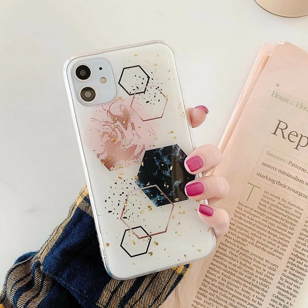 - Eye-catchy, sleek, and stylish. These iPhone cases with gold foil geometric marble designs are made from a slim, transparent cover that adds protection to your phone, camera, and ports. It gives your iPhone a whole fashionable look
