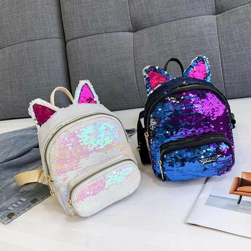 - Sheeny, chic and proven convenient. The Sequins Cat Ear Travel Backpacks are your perfect go-to bag for any rave, festival, party, and even during your social gatherings.