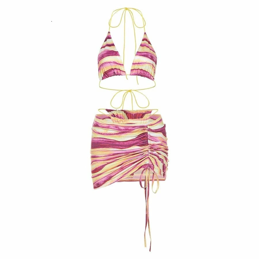 Kinky Cloth Skirts Tie Dye Ruched Skirt Bikini Set