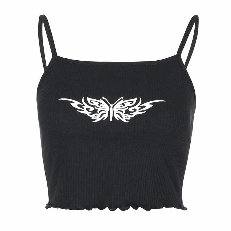 - Don’t let boring crop tops define you! This ladies camis tee features a sexy spaghetti strap, butterfly print, cropped top, and plain black fabric