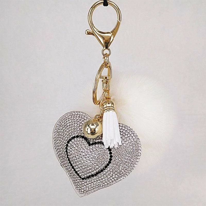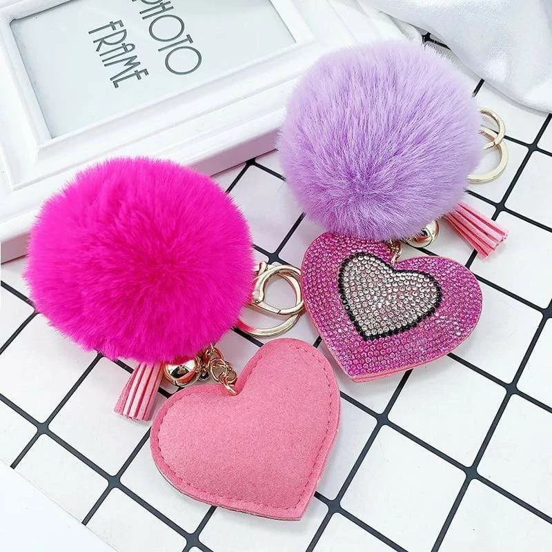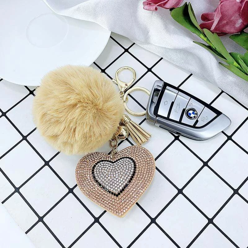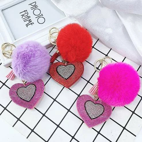 - Shiny, cute and very functional. The Pompom Rhinestone Key Chain is a fashionable piece that features a fur ball and heart full of rhinestones that dangles whenever you’re moving. You can put it on your bag, wallet, or anywhere to keep you in a pleasant mood
